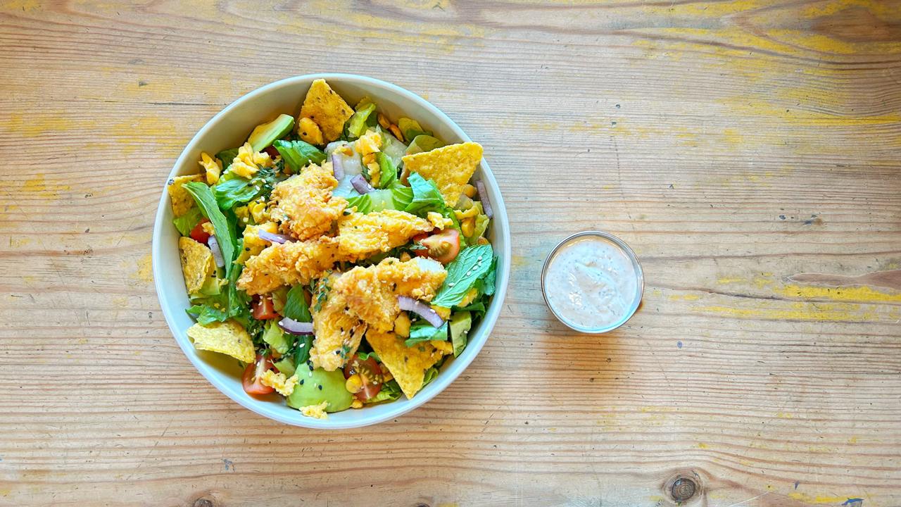 chicken tenders, lettuce, avocado, roasted corn, cheddar, jalapeno, onion, tortilla chips, cherry tomatoes, ranch parmesan