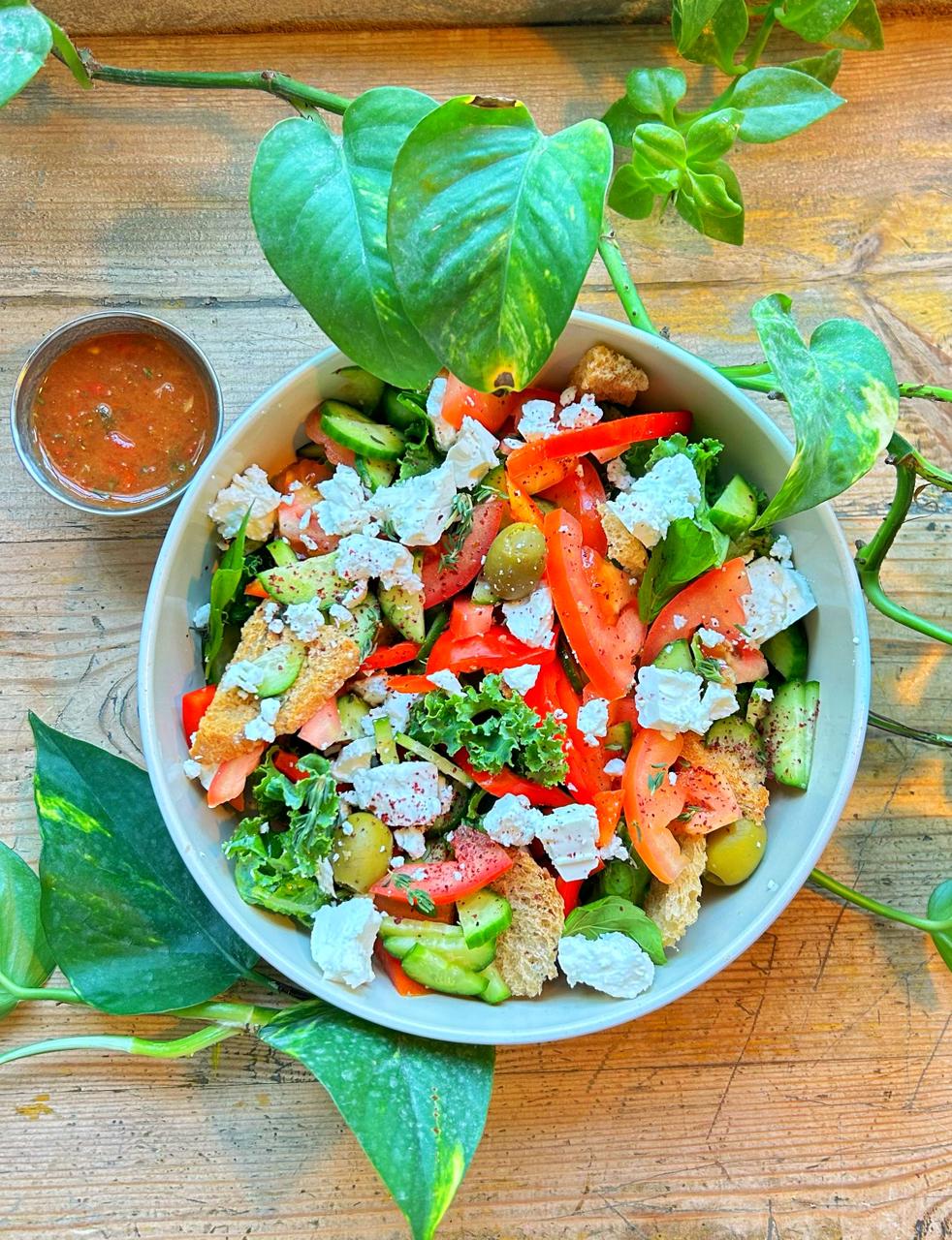feta, tomato, bell pepper, cucumber, olives, kale, toasted country bread, date vinaigrette