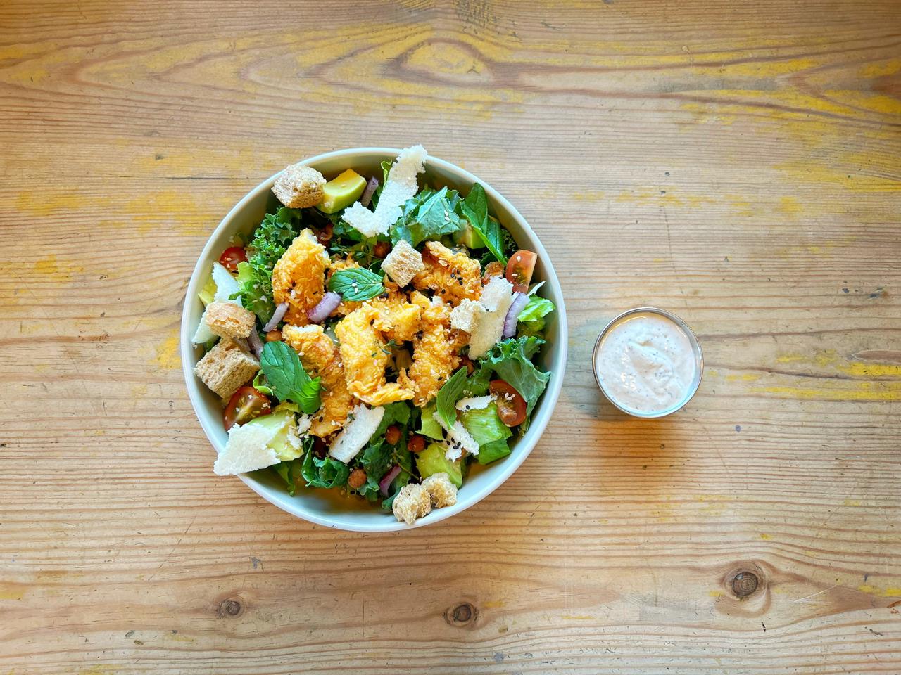 chicken tenders, kale, lettuce, avocado, roasted chickpeas, parmesan, onion, cherry tomatoes, croutons, ranch parmesan